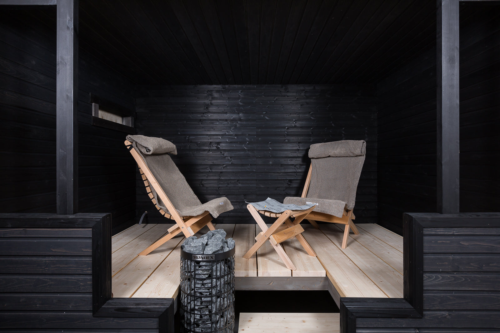 This is our medium size chair and is most sold for the sauna interior use. When the chair is placed in a sauna, the recommended bench depth minimum is 100cm. The chair can easily be folded. Available accessories are armrests and W10 footrest. Note that the armrests extend the width of the chair by 13cm.